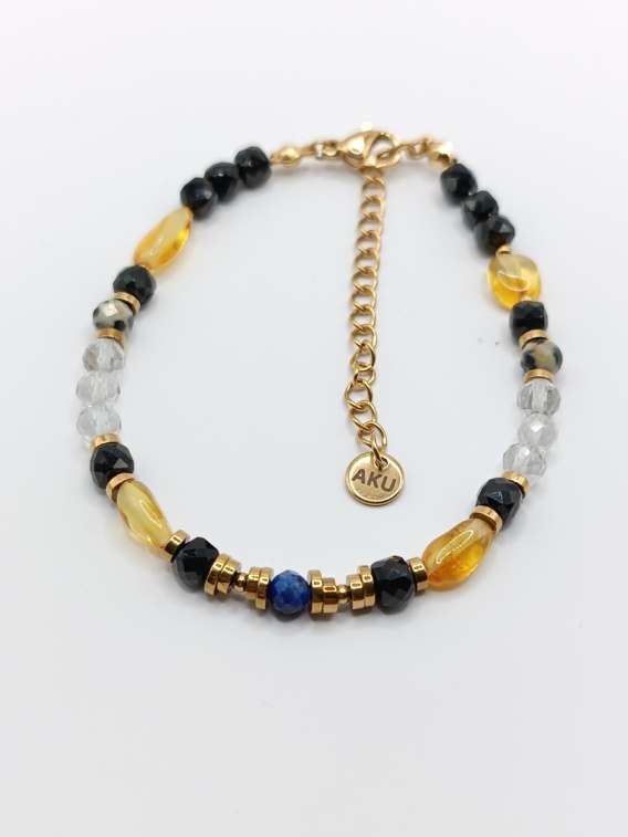 Bransoletka z czarnego turmalinu, bursztynu i kryształu górskiego – energetyczna, naturalna i pełna harmonii. Idealna dla osób, które kochają biżuterię z charakterem.