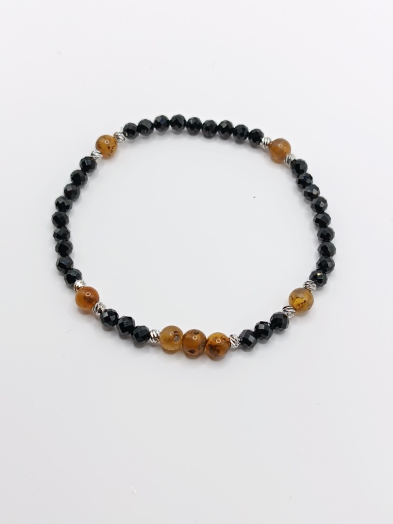 Minimalistyczna bransoletka uniwersalna z czarnego turmalinu i bursztynów. Małe oczko i naturalne kamienie tworzą subtelny, a zarazem energetyczny dodatek dla niej i dla niego.