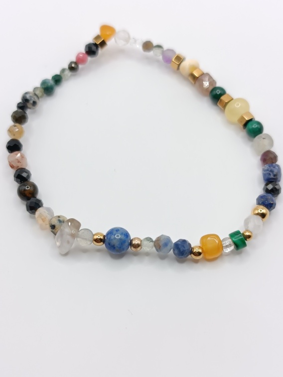 Ta wyjątkowa bransoletka łączy w sobie różnorodne naturalne kamienie, tworząc niepowtarzalny, kolorowy miks. Złote przeplotki ze stali szlachetnej dodają całości elegancji i podkreślają wyjątkowy charakter biżuterii.