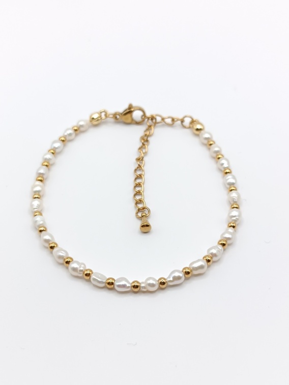 Delikatna, regulowana bransoletka „Perłowe Muśnięcie” z małym oczkiem i złotymi przeplotkami. Subtelny design podkreśla elegancję i kobiecy charakter biżuterii.