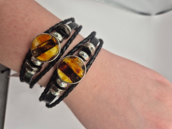 Elegancka bransoletka skórzana z bursztynem, wykonana z naturalnej skóry i ozdobiona unikatowym kawałkiem bałtyckiego bursztynu. Połączenie ciepłych, złocistych odcieni kamienia z klasyczną skórą tworzy ponadczasowy dodatek, który doskonale pasuje zarówno do codziennych, jak i eleganckich stylizacji. Każdy egzemplarz jest niepowtarzalny dzięki naturalnemu pochodzeniu bursztynu.