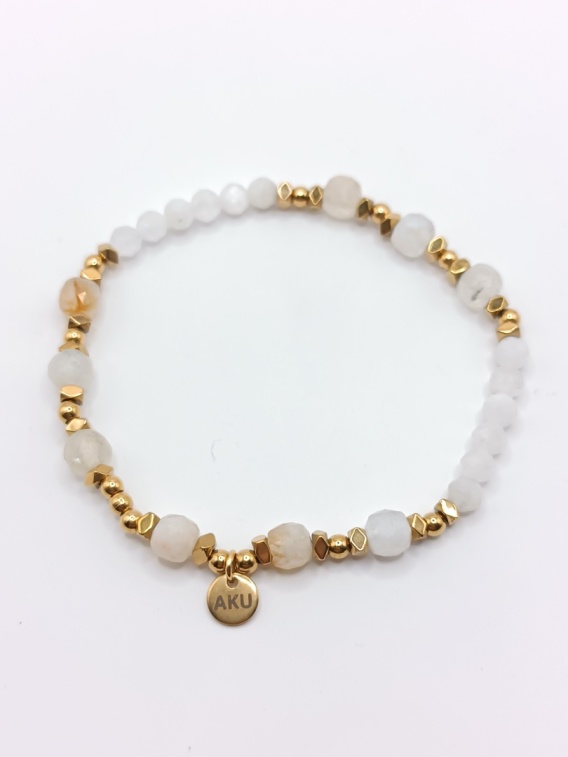 Ta bransoletka na gumce z cytrynem i kamieniem księżycowym to harmonijne połączenie naturalnego blasku kamieni i eleganckiego złotego wykończenia.
