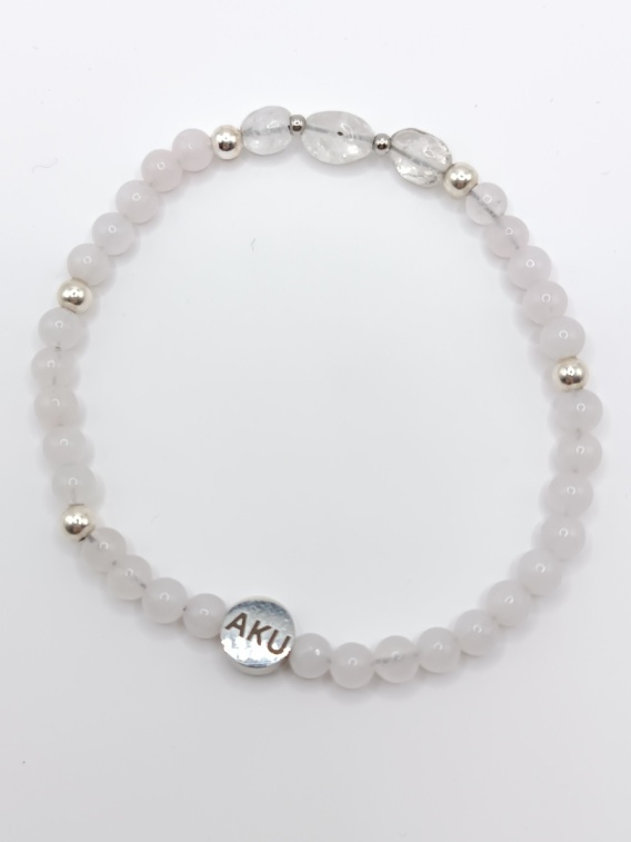 Bransoletka z naturalnego kwarcu różowego i kryształu górskiego, wykończona srebrną stalą szlachetną. Na środku znajduje się duży logotyp AKU. Elegancka, ręcznie wykonana i pełna pozytywnej energii.