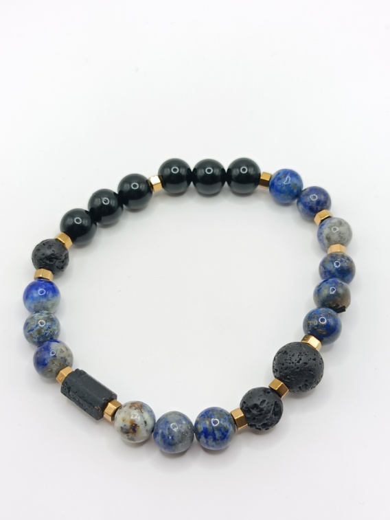 Ta bransoletka z lapisu lazuli, lawy wulkanicznej i czarnego turmalinu to wyjątkowe połączenie głębokich kolorów i naturalnych energii.