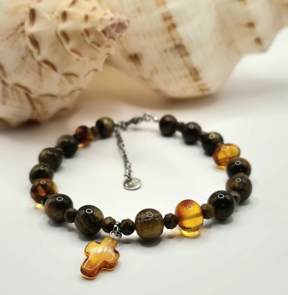 Bransoletka z tygrysiego oka z bursztynowym krzyżem