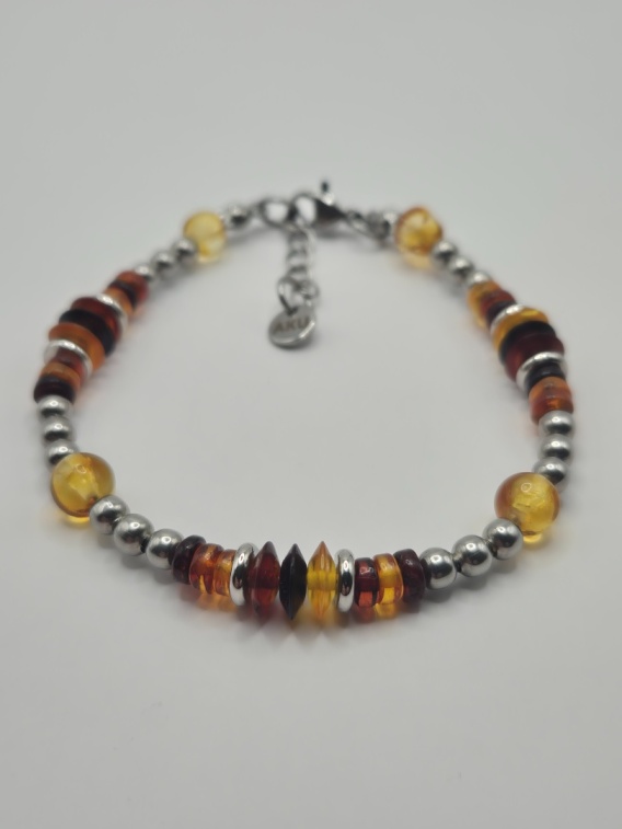 Ręcznie wykonana bransoletka z naturalnego bursztynu to połączenie tradycji i nowoczesności. Ciepły odcień bursztynu pięknie komponuje się ze stalą szlachetną, tworząc elegancki, a zarazem subtelny dodatek na każdą okazję. Solidne zapięcie ze stali zapewnia trwałość i wygodę noszenia, a każdy bursztyn jest unikatowy — dzięki czemu każda bransoletka ma swój niepowtarzalny charakter. To biżuteria, która podkreśli Twój styl i doda blasku każdej stylizacji.