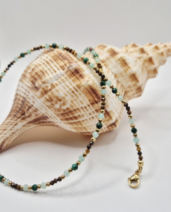 Ten wyjątkowy naszyjnik został wykonany z drobnych, naturalnych minerałów, które razem tworzą harmonijną, elegancką i wyrazistą kompozycję. Dominujące koraliki amazonitu i malachitu o średnicy 3 mm wprowadzają świeżość, zmysłowość i głębię zieleni, podczas gdy drobne 2-milimetrowe tygrysie oko dodaje naszyjnikowi ciepłych, karmelowych refleksów.