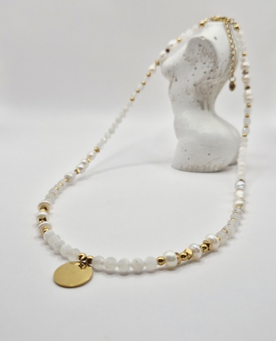 Delikatny naszyjnik z naturalnych pereł i kamienia księżycowego o wielkości 4 mm, wykończony złotymi akcentami. Długość regulowana 45–50 cm. Kobiecy, subtelny i pełen blasku.