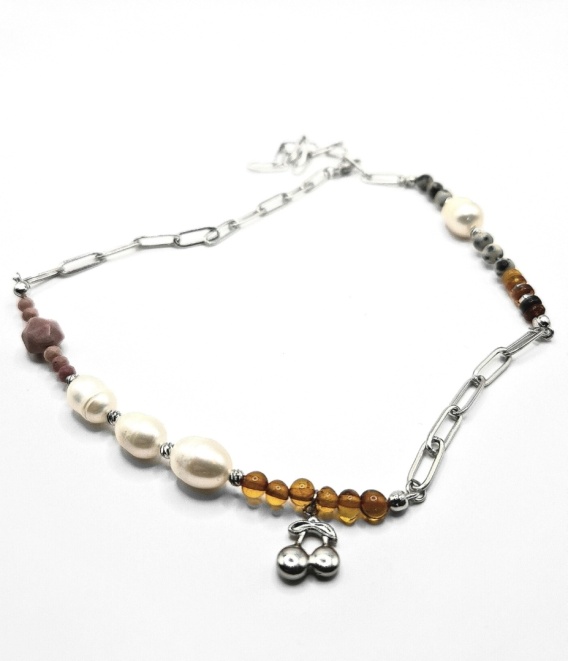 Ten unikatowy naszyjnik to połączenie naturalnych minerałów i pereł w nowoczesnym, lekko asymetrycznym wydaniu. Kompozycję tworzą ciepłe odcienie bursztynu, romantyczny róż rodonitu, charakterystyczny wzór jaspisu dalmatyńskiego oraz klasyczny połysk pereł. Całość uzupełniają minimalistyczne ogniwa ze stali szlachetnej oraz urocza zawieszka w kształcie wisienek.