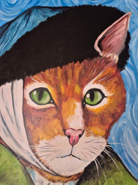„Van Koth” to autorska praca, która w przewrotny i pełen uroku sposób nawiązuje do jednego z najbardziej rozpoznawalnych autoportretów w historii sztuki. W miejsce twarzy van Gogha pojawia się kocia sylwetka — charakterystyczne uszy, wibrysy i kocie spojrzenie — jednak cała kompozycja zachowuje klimat oryginalnej palety barw i pociągnięć pędzla inspirowanych stylem mistrza.