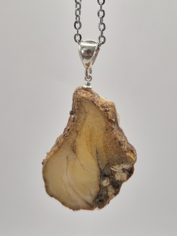 Wyjątkowa zawieszka wykonana z jednego plastra naturalnego bursztynu bałtyckiego w ciepłym, miodowym odcieniu.